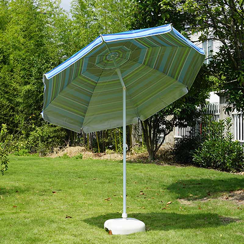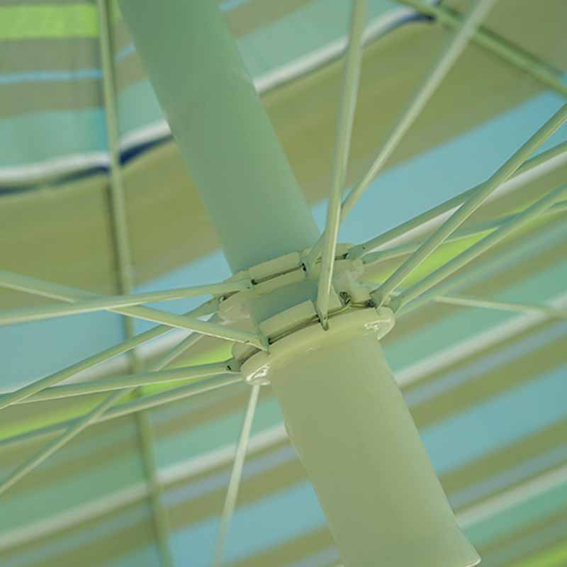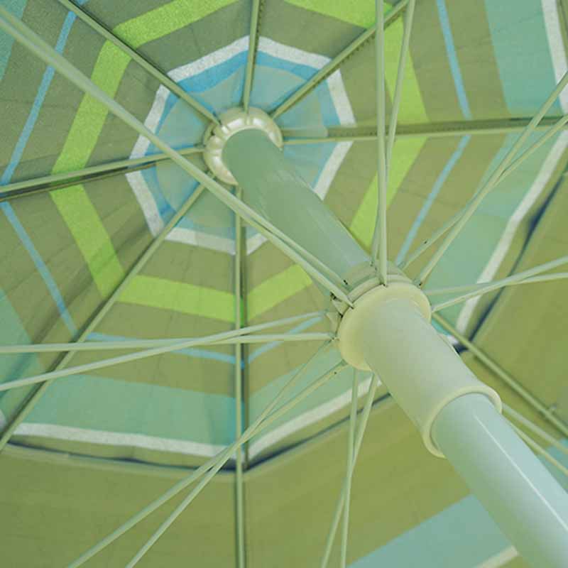 Pole i rebra izrađeni su od visokokvalitetnog čelika, koji ima izuzetno visoku čvrstoću i izdržljivost. Promjer stupa su φ32/22 mm, φ32/32 mm i φ32/32mm, a promjeri rebra su φ3,0 mm, φ2.8 mm i φ3,5 mm & φ3.0 mm, kako bi se osiguralo da se okvir kišobrana ne može lako deformirati i oštetiti tijekom dugotrajne uporabe. Površina kišobrana izrađena je od tkanine od 120 g poliestera sa srebrnom oblogom, koja ne samo da ima dobar efekt zasjenjenja, već i učinkovito odražava ultraljubičaste zrake kako bi zaštitila kožu od štete. Prugasti dizajn je moderan i lijep, dodajući vitalnost i zabavu aktivnostima na otvorenom. The