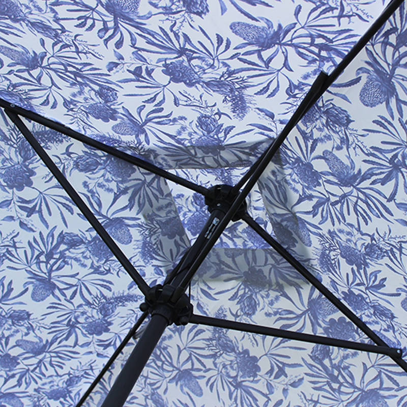 Pole i rebra ovog vrtnog kišobrana izrađena je od visokokvalitetnog čelika, osiguravajući čvrstinu i stabilnost kišobrana. Promjer kišobran je 34 mm ili 38 mm, što može podnijeti velike sile vjetra i osigurati sigurnost kišobrana kada se koristi na otvorenom. Rebra kišobrana izrađena su od čeličnih rebara od 12 mm*18 mm, s ukupno 4 ili 8 rebara, što može ravnomjerno poduprijeti površinu kišobrana, što površinu kišobrana čini ravnijom i stabilnijom.
