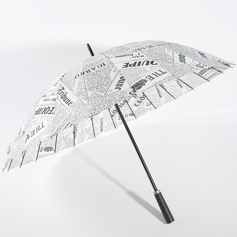 Izravni kišobran u stilu novina Ru1962 izrađen je od tkanine od 190 T poliester Pongee, koja je lagana, vodootporna i izdržljiva i može učinkovito odoljeti invaziji na kišu. Uzorak na površini kišobrana izrađen je od napredne tehnologije ispisa, sa svijetlim bojama, jasnim uzorcima i nije lako izblijediti.